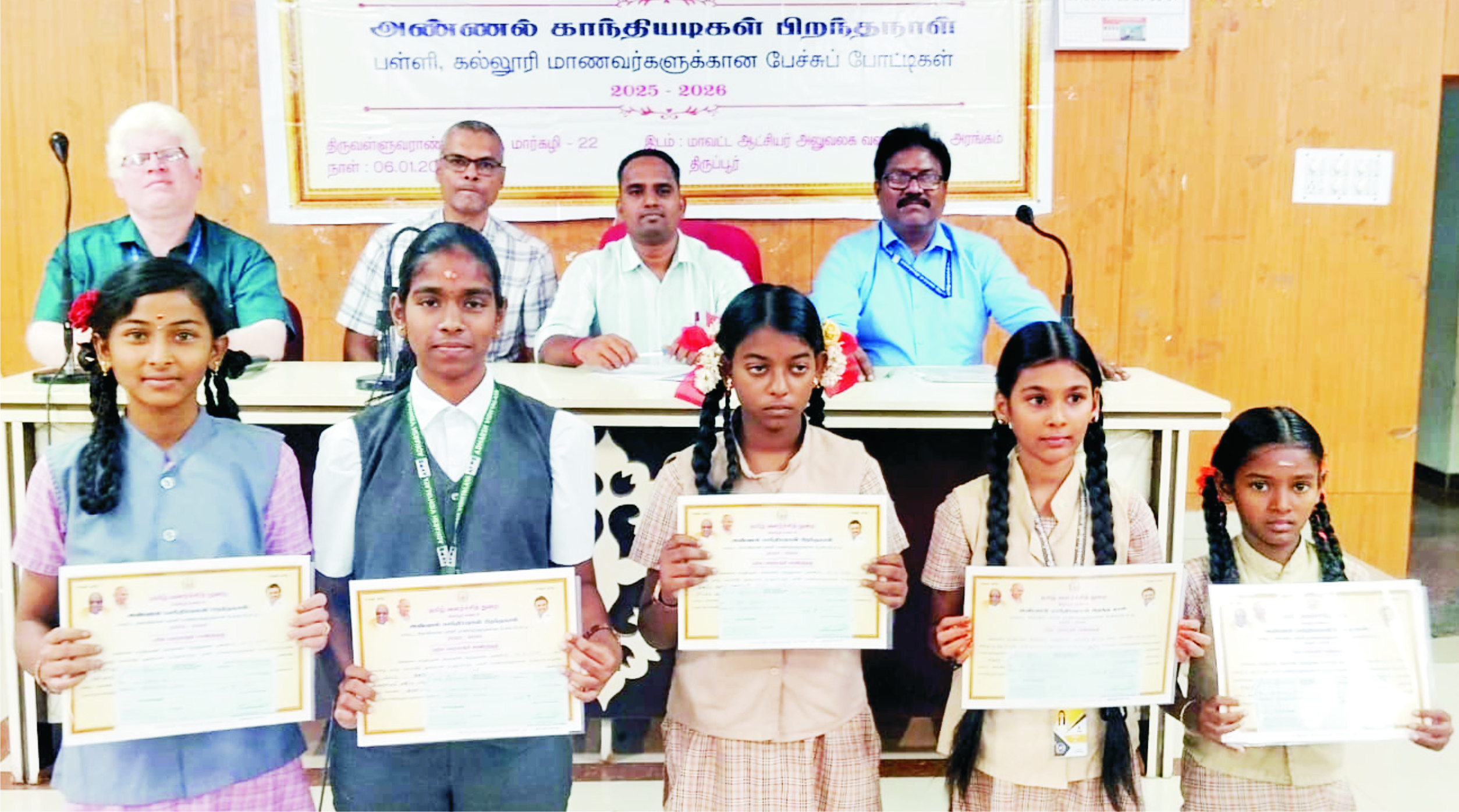 திருப்பூர் மாவட்ட தமிழ் வளர்ச்சி துறை துணை இயக்குநர் வ.சுந்தர் தலைமை தாங்கி சிறப்புரை ஆற்றி பரிசுகளை வழங்கினார். போட்டியின் முடிவில் காளிபாளையம், குருவாயூரப்பன் நகர் அரசு உயர்நிலைப் பள்ளி 9 ஆம் வகுப்பு மாணவி தன்யாஸ்ரீ முதலிடம் பெற்றார். இவருக்கு ரூ.5 ஆயிரத்திற்கான காசோலை வழங்கப்பட்டது. பல்லடம் ஆதர்ஷ் வித்யாலயா பள்ளி 11 ஆம் வகுப்பு மாணவி வைஷ்ணவலட்சுமி 2 ஆம் இடம் பெற்றார். இவருக்கு ரூ.3 ஆயிரத்திற்கான காசோலை வழங்கப்பட்டது. உடுமலை, பெதப்பம்பட்டி இலுப்பன் நகர் ஊராட்சி ஒன்றிய நடுநிலைப் பள்ளி 8 ஆம் வகுப்பு மாணவி இனியா மூன்றாம் இடம் பெற்றார். இவருக்கு ரூ.2 ஆயிரத்திற்கான காசோலை வழங்கப்பட்டது. அரசு பள்ளிகளான மங்கலம் அரசு பெண்கள் உயர்நிலைப்பள்ளி 7 ஆம் வகுப்பு மாணவி முன்ஷிஃபா, இடுவம்பாளையம் அரசு மேல்நிலைப்பள்ளி 7 ஆம் வகுப்பு மாணவி காவ்யஸ்ரீ ஆகியோருக்கு தலா 2000 ற்கான காசோலை சிறப்பு பரிசுகளாக வழங்கப்பட்டது. நிகழ்ச்சிக்கான ஏற்பாடுகளை தமிழ் வளர்ச்சி துறை அலுவலர்கள் மணிமேகலை, மேரி, பாஷா ஆகியோர் செய்து இருந்தனர். மதியம் கல்லூரி மாணவர்களுக்கான போட்டிகள் நடந்தது. நாளை (7 ந் தேதி) பண்டிட் ஜவஹர்லால் நேரு குறித்த பேச்சு போட்டிகள் நடக்கிறது.